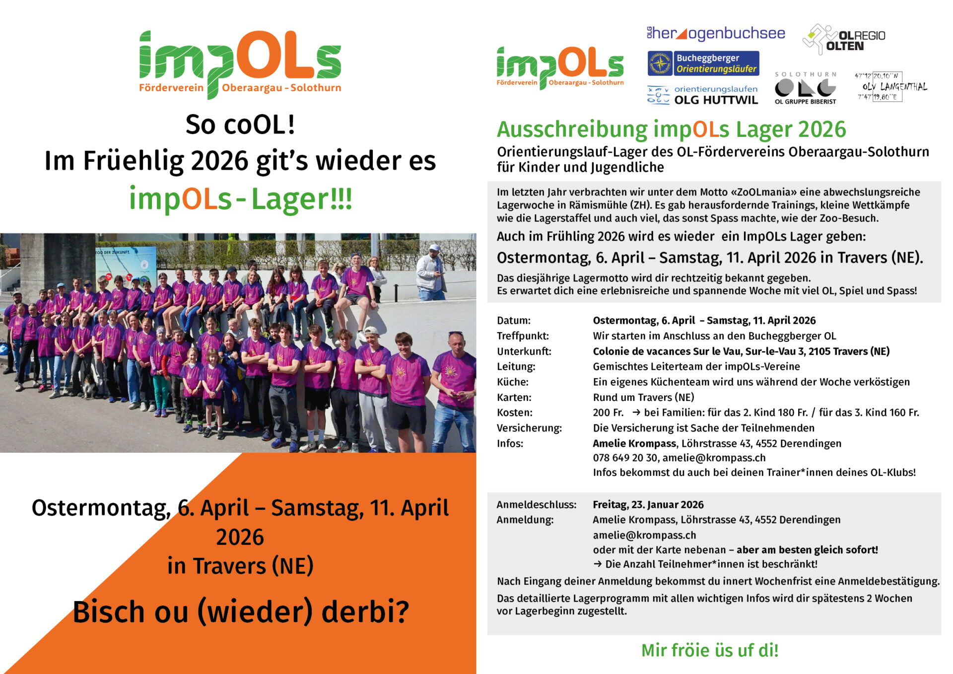 Die Anmeldung für das traditionelle ImpOLs Lager 2026 über Ostern ist jetzt offen. Meldet euch mit dem folgenden Formular an und lasst euch dieses tolle Trainingslager nicht entgehen!